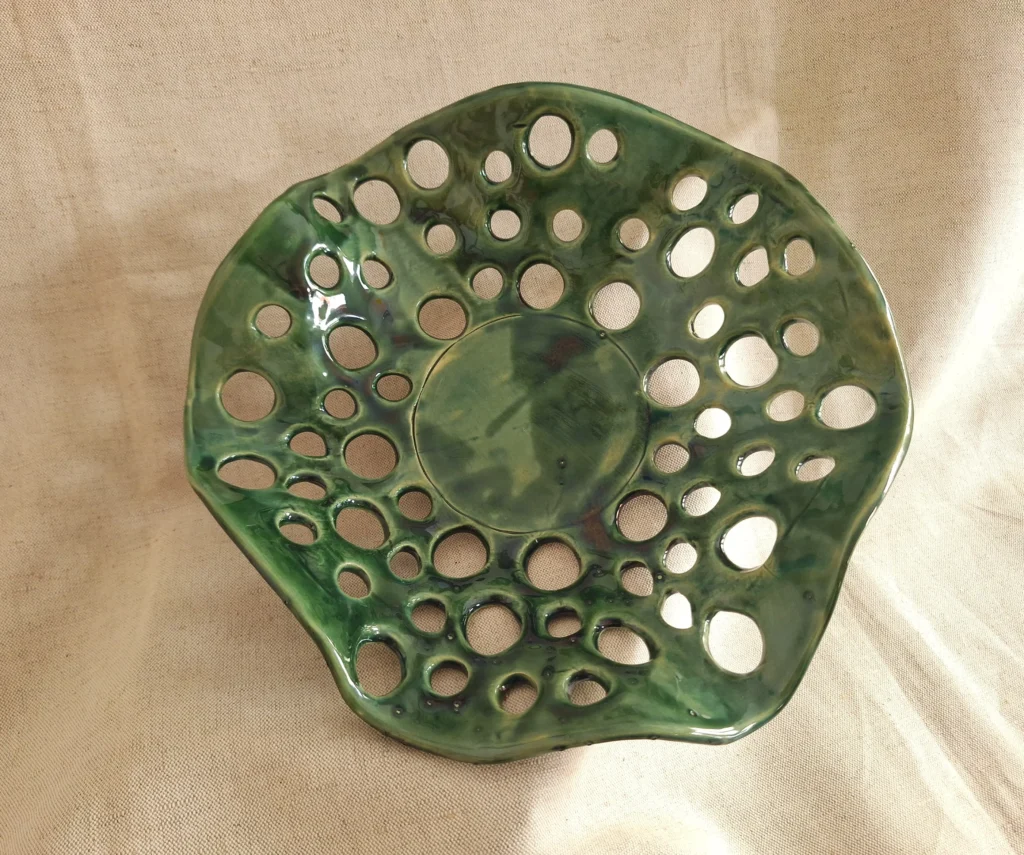 Kerámia táljait agyagból teremti. Az izgalmas technikát, mellyel alkot, 10 éve tanulta és tökéletesíti azóta.