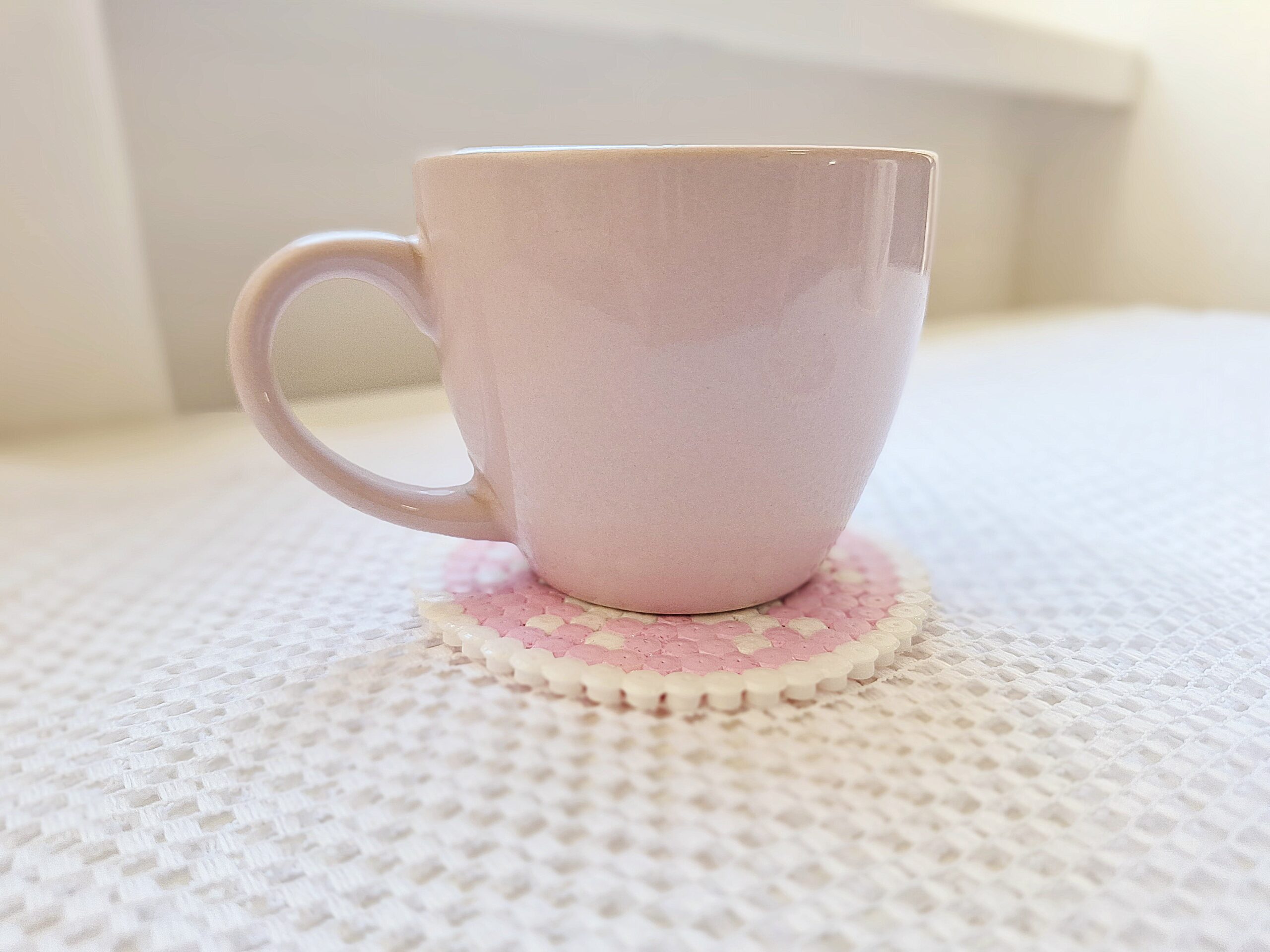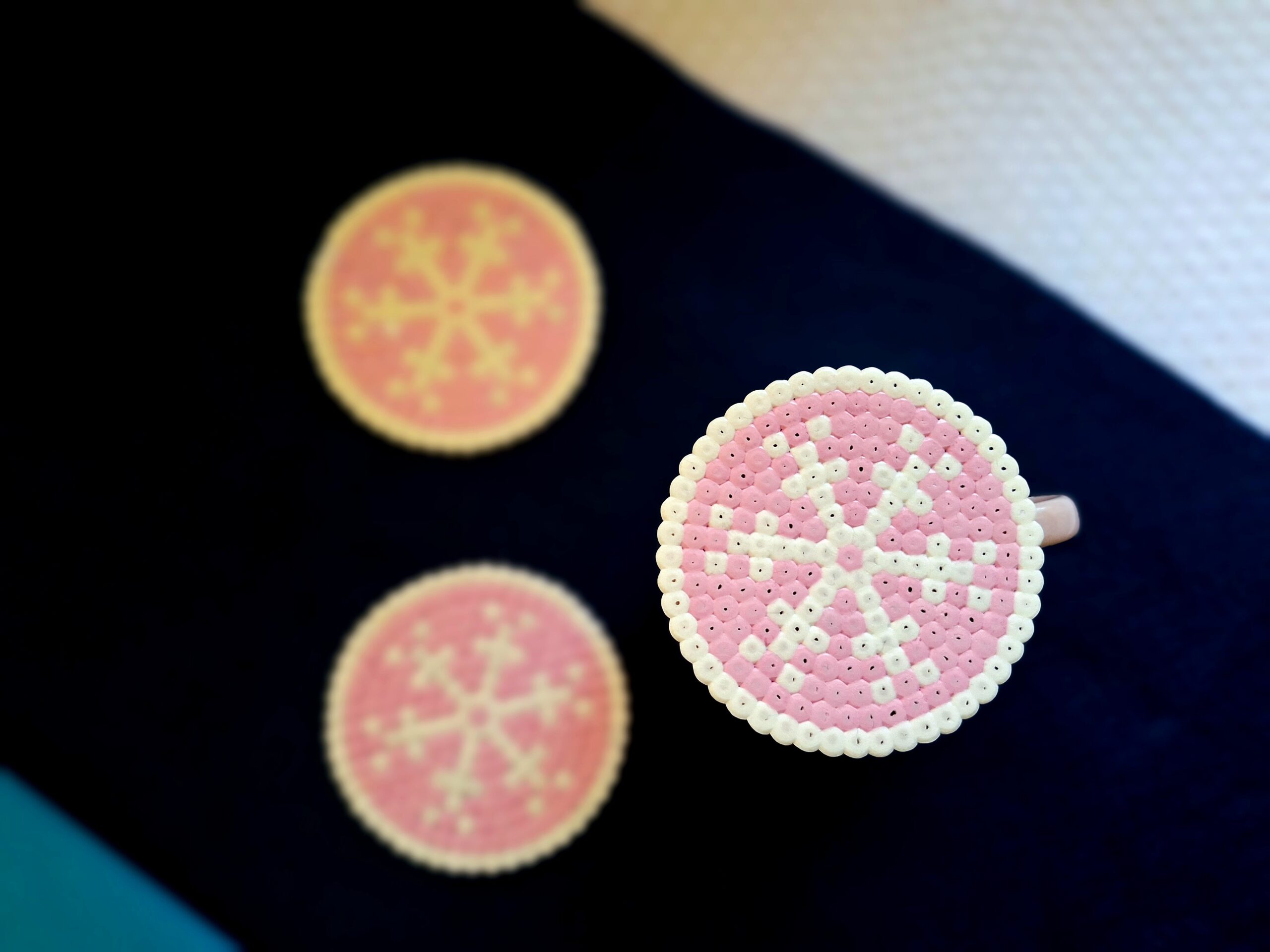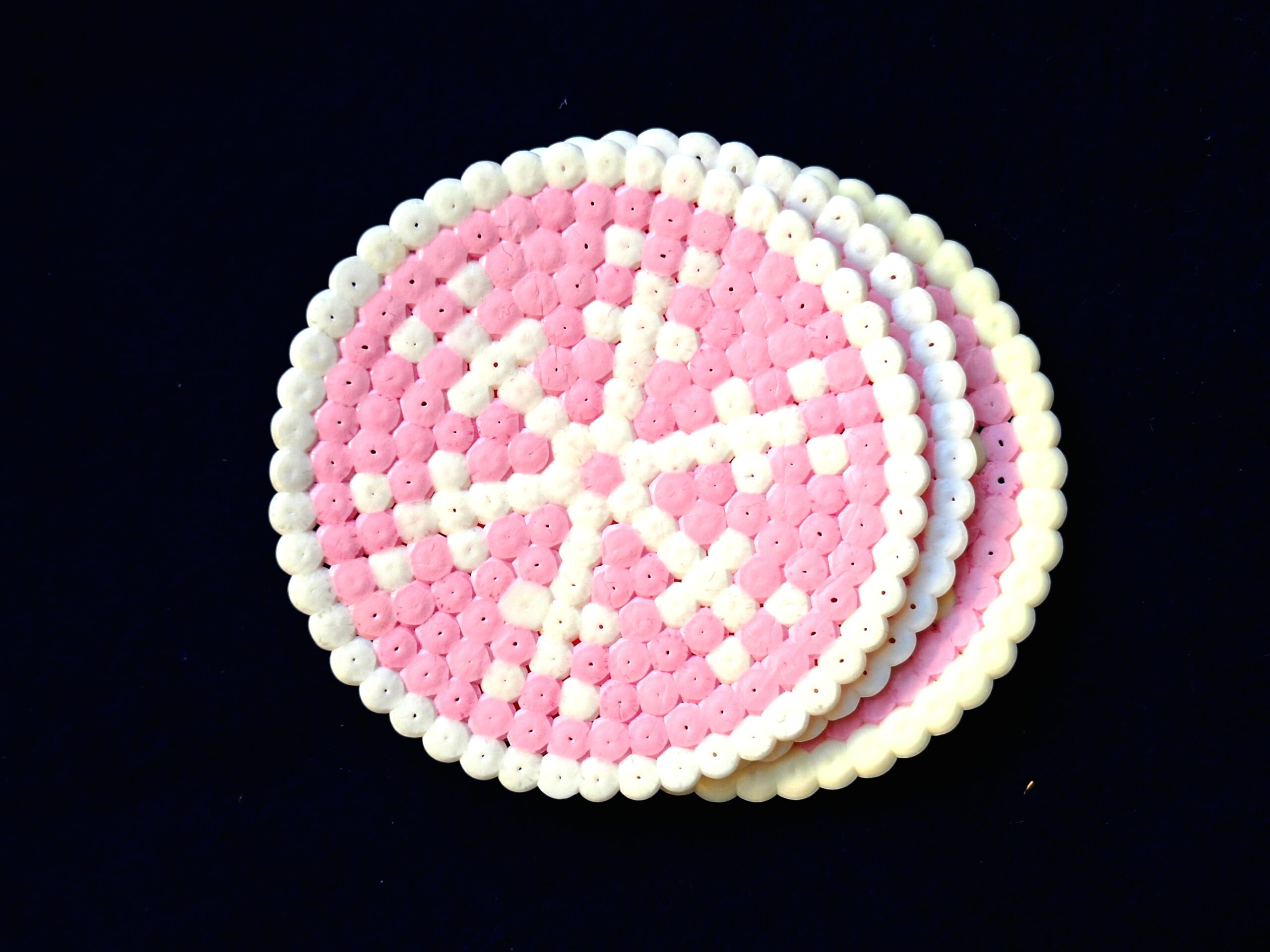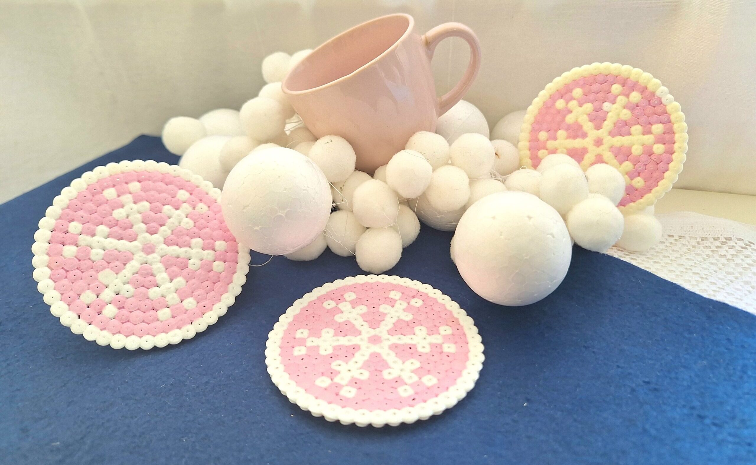 Rózsaszín- fehér gyöngyvasalás technikával készült 3db-os szett.